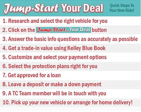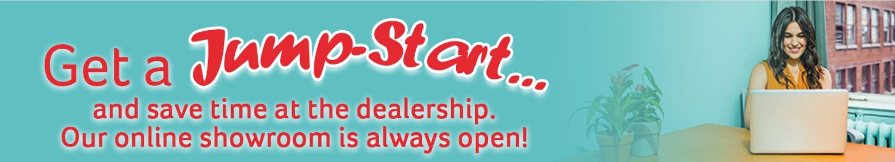 With Jump-Start, we give you the ability to complete as much or as little of the vehicle purchase process using our website. Browse our new and used inventory to find the right vehicle for you. Then, click the "Jump-Start...Your Deal" button to customize your new vehicle payments, apply for financing, select the right protections for you, make a down payment, and more. Our team will seamlessly pick up where you left off once you're at the dealership, or you can even arrange for home delivery!